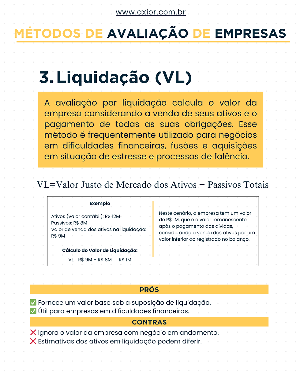 Neste caso, calcula-se o valor que a empresa teria se todos os seus ativos fossem vendidos e as dívidas quitadas imediatamente. Esse método é útil em situações de falência ou encerramento das atividades, pois fornece uma estimativa realista do valor mínimo do negócio.